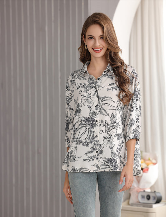 Women's Floral Printed Button Down Shirt with 3/4 Sleeves