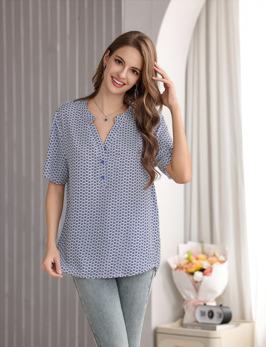 Women's Heart Print Short-Sleeve Pullover Top with V-Neck Mandarin Collar