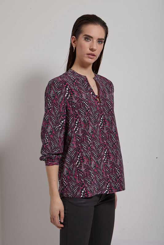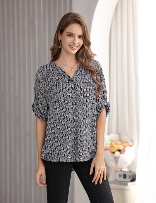 Women's Geometric Print Top with 3/4 Sleeve Roll Tab for Short Sleeve