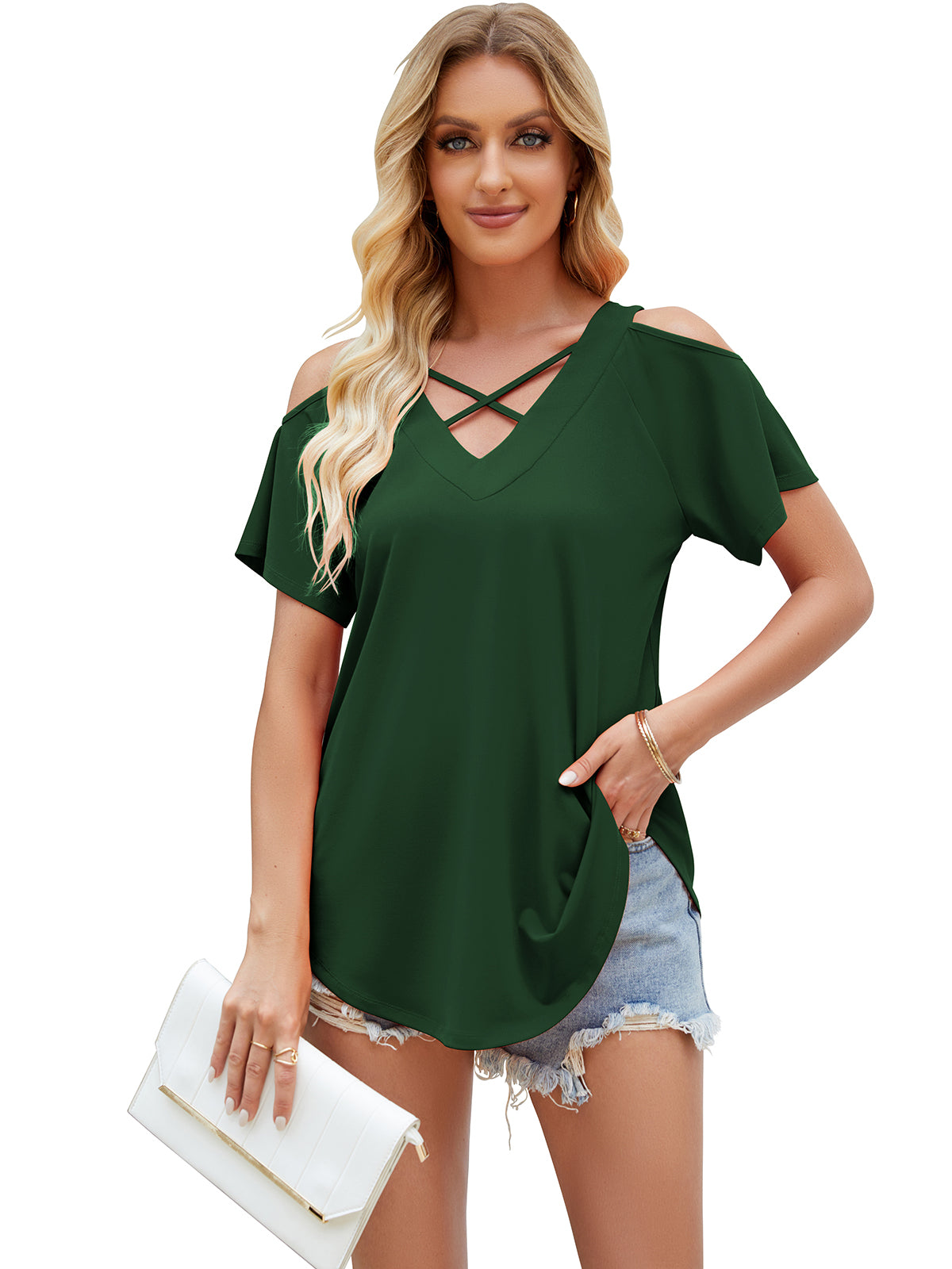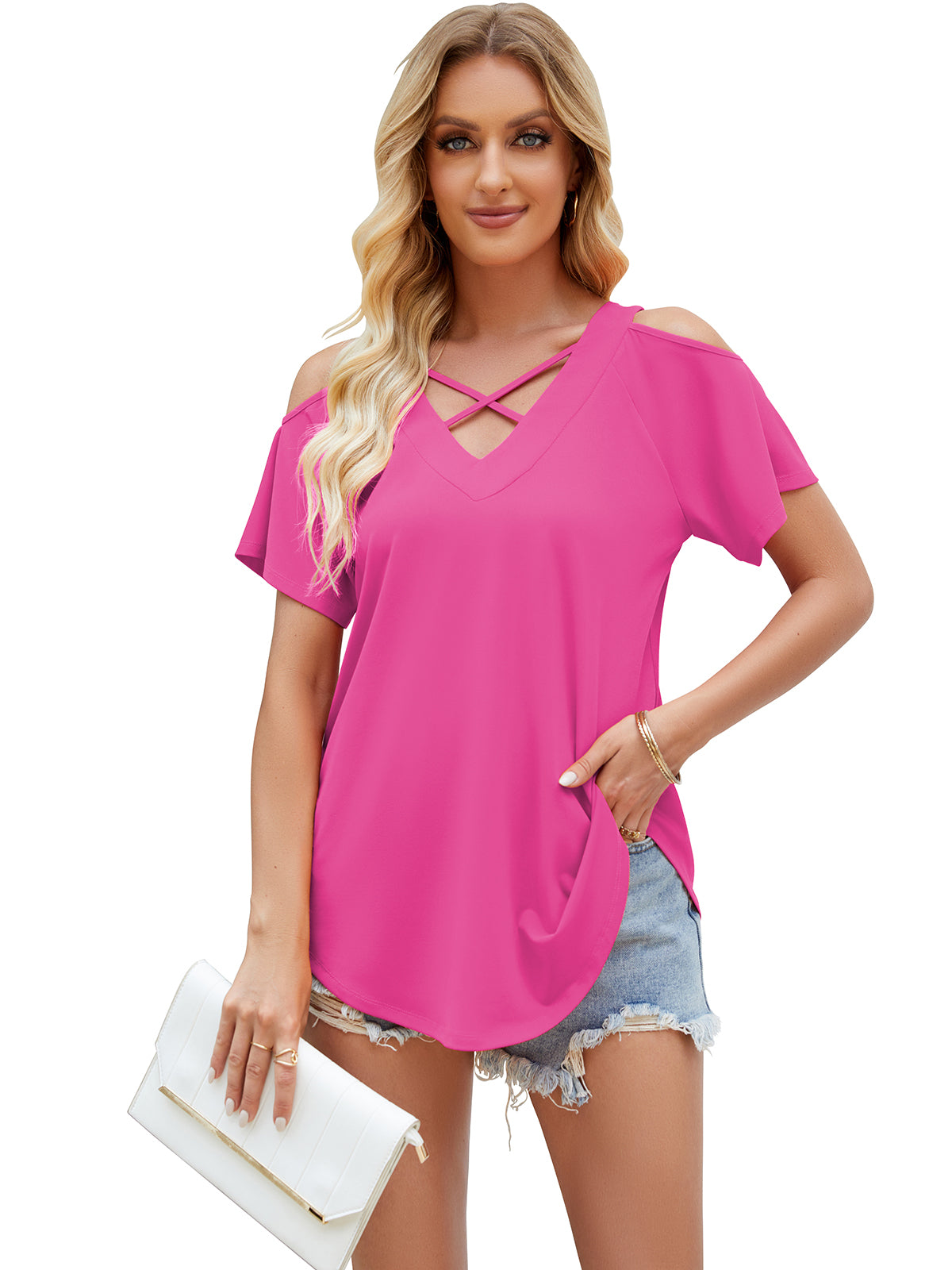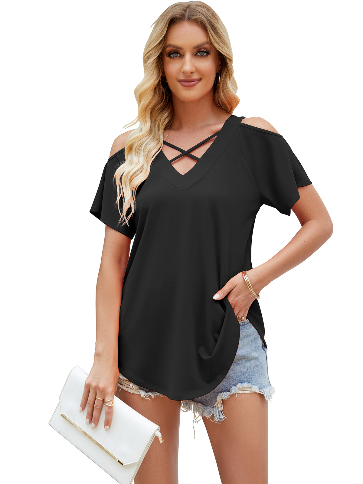 Cold Shoulder Tops for Women Summer Shirts V Neck Criss Cross Tops Sexy Blouse, Solid Color S-XXL